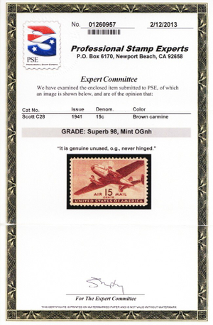 Due to the high cost of obtaining certificates we will only refund the cost of the stamp and not the cost of the certificate for stamps that sell for less than $250 that come back with a negative certificate. Stamps that sell for above $250 will receive a full refund for both the price of the stamp and cost of the certificate if it should come back not as described. For U.S. stamps only certificates from either APS, PSE or from the Philatelic Foundation are accepted, however "graded" certificates or "encased" items are not accepted.