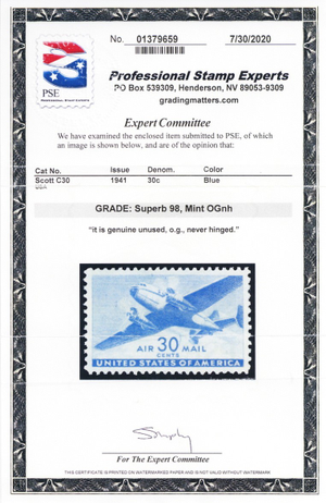 C30, Mint NH Superb 30¢ - PSE Graded 98 Certificate - Stuart Katz