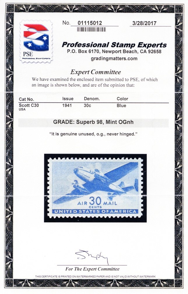 C30, Mint NH Superb 30¢ With Graded 98 PSE Certificate Stuart Katz