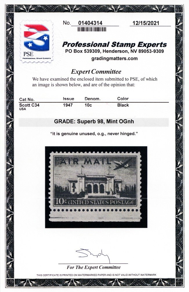 C34, Mint NH Superb 10¢ With Graded 98 PSE Certificate Stuart Katz