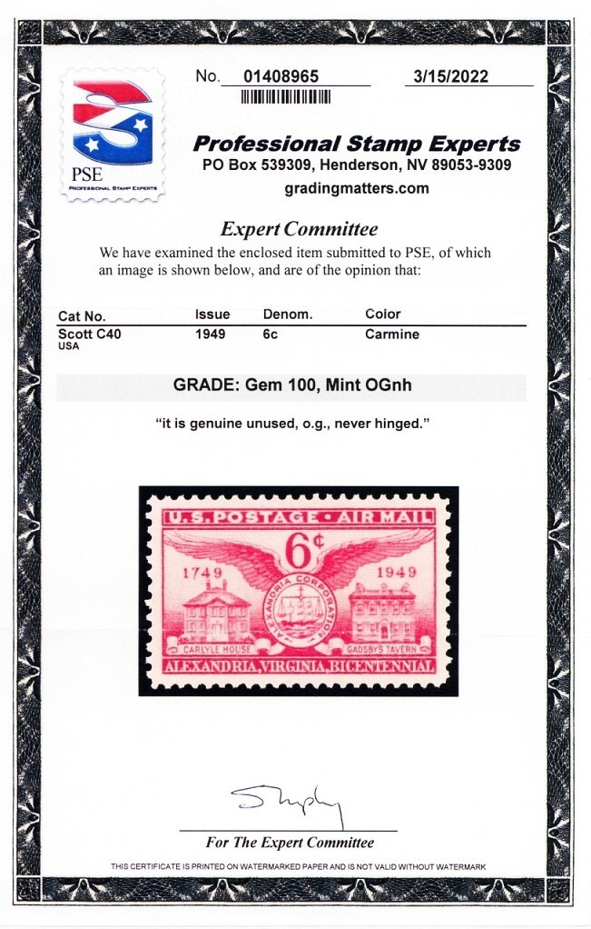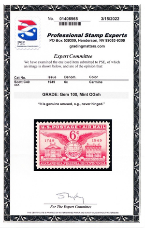 Due to the high cost of obtaining certificates we will only refund the cost of the stamp and not the cost of the certificate for stamps that sell for less than $250 that come back with a negative certificate. Stamps that sell for above $250 will receive a full refund for both the price of the stamp and cost of the certificate if it should come back not as described. For U.S. stamps only certificates from either APS, PSE or from the Philatelic Foundation are accepted, however "graded" certificates or "encased" items are not accepted.