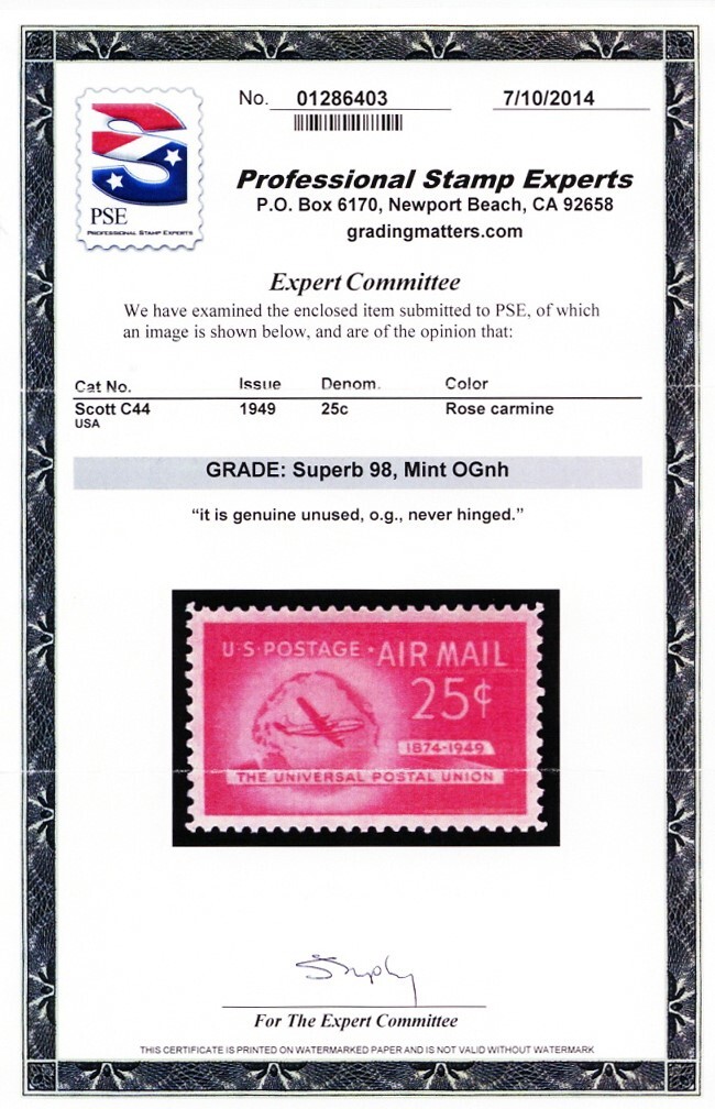 Due to the high cost of obtaining certificates we will only refund the cost of the stamp and not the cost of the certificate for stamps that sell for less than $250 that come back with a negative certificate. Stamps that sell for above $250 will receive a full refund for both the price of the stamp and cost of the certificate if it should come back not as described. For U.S. stamps only certificates from either APS, PSE or from the Philatelic Foundation are accepted, however "graded" certificates or "encased" items are not accepted.