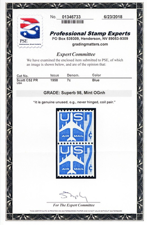 C52, Mint NH Superb 7¢ Pair With Graded 98 PSE Certificate Stuart Katz