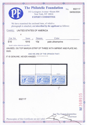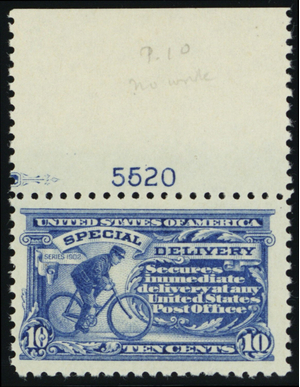 E10, Mint VF NH 10¢ PL# Special Delivery - PFC Certificate (copy) Stuart Katz