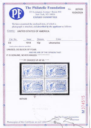 E9, Mint VF/XF NH 10¢ Special Delivery - With PFC Certificate (copy) Stuart Katz