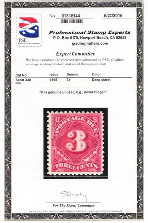 J40, Mint NH VF 3¢ Postage Due - With PSE Certificate SCV $225 - Stuart Katz