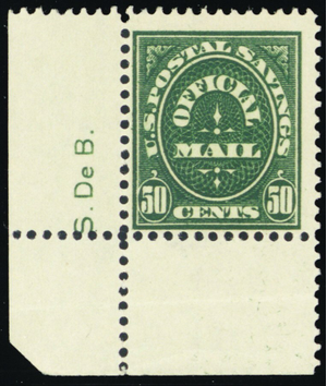 O122, RARE Mint NH 50¢ Official Stamp With Sideographer's Initials - Stuart Katz