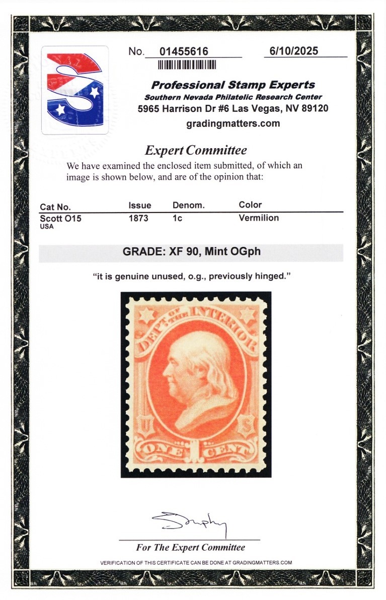 O15, Mint XF VLH 1¢ - With Graded 90 PSE Certificate - Stuart Katz