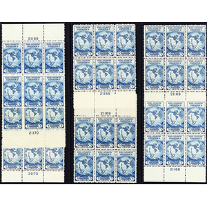 733, Mint VF NH 3¢ SEVEN Plate Blocks CV $105.00 - Stuart Katz