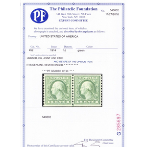 452, Mint NH XF 1¢ Coil Line Pair - With Graded 90 PFC Certificate - Stuart Katz