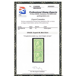 604, Mint Superb NH 1¢ Coil Pair - With Graded 98 PSE Certificate - Stuart Katz