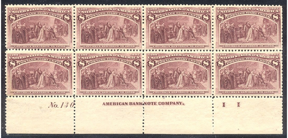 Scott #236: 1893 8c Columbian Centering & Condition: Mint. Fresh. Very Fine and CHOICE Plate Block Reverse (Gum Side): Original gum. Faintly Hinged. Faults / Imperfections: None The item pictured is the actual item you are purchasing, unless otherwise noted. I also offer an interest-free layaway plan. Ask me about it!" All items will be mailed a day or two after payment is received. ![]() ![]() ![]() --------------------------------------------------------------------------------