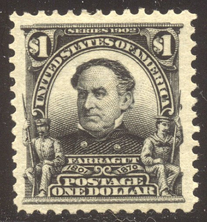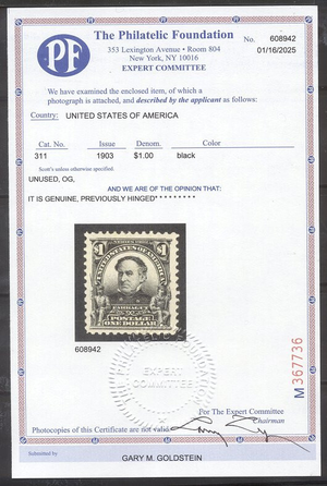 Scott #311: 1902 $1.00 Farragut Centering & Condition: Mint. Fresh. Rich color. Extremely Fine and CHOICE. A Foundation Certificate accompanies.. Reverse (Gum Side): Original gum. Lightly Hinged. Faults / Imperfections: None The item pictured is the actual item you are purchasing, unless otherwise noted. I also offer an interest-free layaway plan. Ask me about it!" All items purchased will be mailed a day or two after payment is received. --------------------------------------------------------------------------------