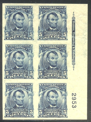Scott #315: 1908 5c Lincoln, Imperf Centering & Condition: Mint. Fresh. Rich colors. Extremely Fine and CHOICE Reverse (Gum Side): Original gum. Never Hinged. Faults / Imperfections: None The item pictured is the actual item you are purchasing, unless otherwise noted. I also offer an interest-free layaway plan. Ask me about it!" All items will be mailed a day or two after payment is received. ![]() ![]() ![]() --------------------------------------------------------------------------------