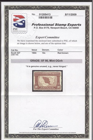 Scott #327: 1904 10c Louisiana Centering & Condition: Mint. Fresh. Extremely Fine and CHOICE! A Graded (90) PSE certificate accompanies. Reverse (Gum Side): Original gum. Never Hinged. Faults / Imperfections: None The item pictured is the actual item you are purchasing, unless otherwise noted. I also offer an interest-free layaway plan. Ask me about it!" All items purchased will be mailed a day or two after payment is received. --------------------------------------------------------------------------------