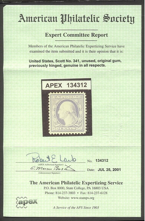 Scott #341: 50c Violet Centering & Condition: Mint. Fresh. Very Fine. An Apex Certificate accompanies. Reverse (Gum Side): Original gum. Hinged. Faults / Imperfections: None The item pictured is the actual item you are purchasing, unless otherwise noted. I also offer an interest-free layaway plan. Ask me about it!" All items purchased will be mailed a day or two after payment is received. --------------------------------------------------------------------------------