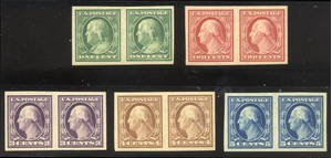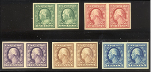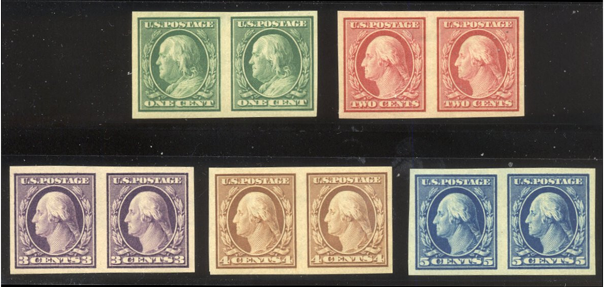 Scott #343-47: 1c - 5c Imperfs, DLW Centering & Condition: Mint. Fresh. Very Fine set of Imperf Pairs. Reverse (Gum Side): Original gum. Never Hinged. Faults / Imperfections: None The item pictured is the actual item you are purchasing, unless otherwise noted. I also offer an interest-free layaway plan. Ask me about it!" All items will be mailed a day or two after payment is received. --------------------------------------------------------------------------------