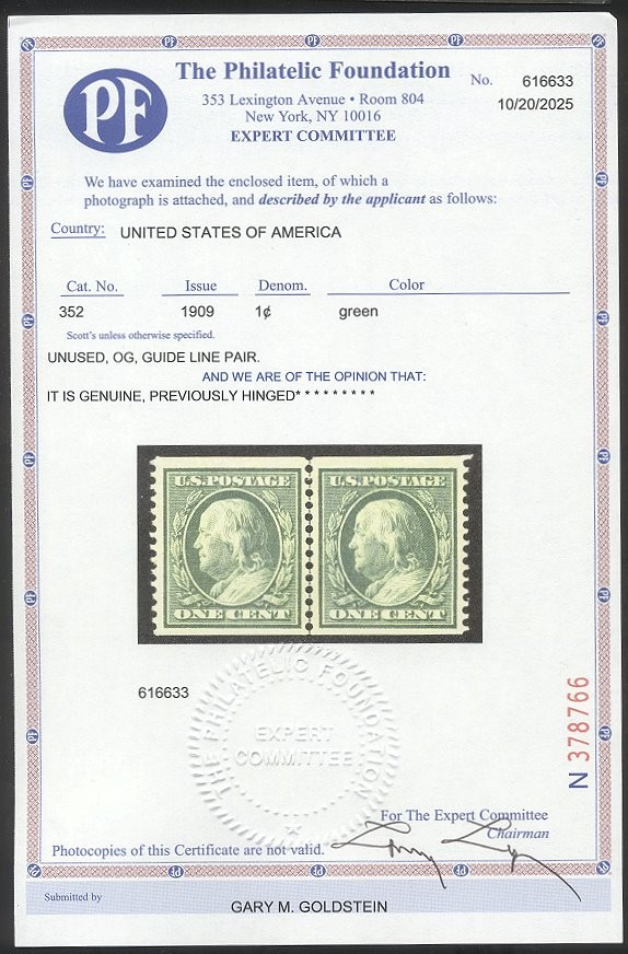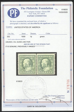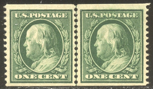 Scott #352: 1c Green, P12 Coil Centering & Condition: Mint. Fresh. Very Fine and SCARCE Line Pair. Reverse (Gum Side): Original gum. Hinged. Faults / Imperfections: None The item pictured is the actual item you are purchasing, unless otherwise noted. I also offer an interest-free layaway plan. Ask me about it!" All items will be mailed a day or two after payment is received. --------------------------------------------------------------------------------