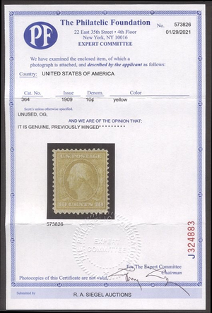 Scott #364: 1909 10c Yellow on Bluish Paper Centering & Condition: Mint. Fresh. Very Fine and SCARCE. Reverse (Gum Side): Original gum. Faintly Hinged. Faults / Imperfections: None (The spot on the nose is not on the stamp) The item pictured is the actual item you are purchasing, unless otherwise noted. I also offer an interest-free layaway plan. Ask me about it!" All items will be mailed a day or two after payment is received. --------------------------------------------------------------------------------