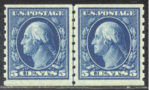 Scott #396: 5c Blue, P8.5 Coil Centering & Condition: Mint. Fresh. Rich color. Very Fine Line Pair. Reverse (Gum Side): Original gum. Never Hinged. Faults / Imperfections: None The item pictured is the actual item you are purchasing, unless otherwise noted. I also offer an interest-free layaway plan. Ask me about it!" All items will be mailed a day or two after payment is received. --------------------------------------------------------------------------------