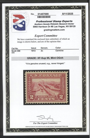 Scott #398: 1913 2c Pan Pacific Centering & Condition: Mint. Fresh. XF/SUP and CHOICE! A GRADED PSE Certificate accompanies. Reverse (Gum Side): Original gum. Never Hinged. Faults / Imperfections: None The item pictured is the actual item you are purchasing, unless otherwise noted. I also offer an interest-free layaway plan. Ask me about it!" All items purchased will be mailed a day or two after payment is received. --------------------------------------------------------------------------------