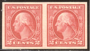 Scott #459: 2c Carmine, Imperf Rotary Coil Centering & Condition: Mint. Fresh. Very Fine Pair. Reverse (Gum Side): Original gum. Never Hinged. Very light fingerprint. Faults / Imperfections: None The item pictured is the actual item you are purchasing, unless otherwise noted. I also offer an interest-free layaway plan. Ask me about it!" All items will be mailed a day or two after payment is received. ![]() ![]() ![]() --------------------------------------------------------------------------------