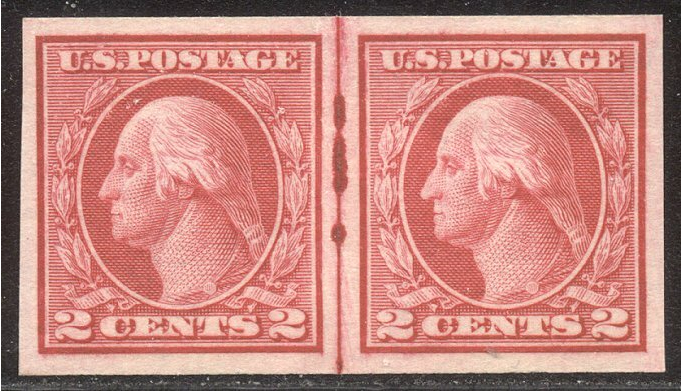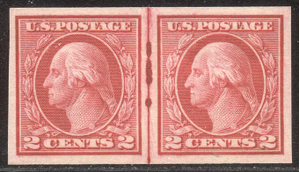 Scott #459: 2c Carmine, Imperf Rotary Coil Centering & Condition: Mint. Fresh. Extremely Fine Pair with crease down the Reverse (Gum Side): Original gum. Never Hinged. Faults / Imperfections: None The item pictured is the actual item you are purchasing, unless otherwise noted. I also offer an interest-free layaway plan. Ask me about it!" All items will be mailed a day or two after payment is received. --------------------------------------------------------------------------------