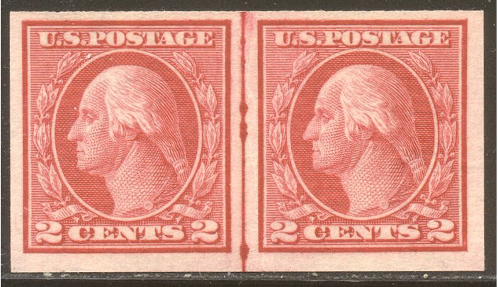 Scott #459: 2c Carmine, Imperf Rotary Coil Centering & Condition: Mint. Fresh. Very Fine Line Pair with typical Reverse (Gum Side): Original gum. Never Hinged. Faults / Imperfections: None The item pictured is the actual item you are purchasing, unless otherwise noted. I also offer an interest-free layaway plan. Ask me about it!" All items will be mailed a day or two after payment is received. --------------------------------------------------------------------------------