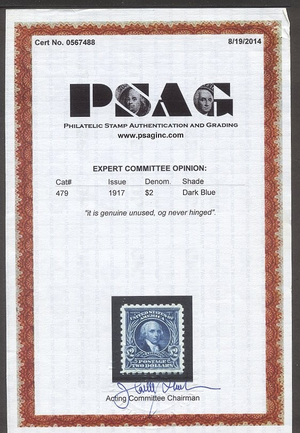 Scott #479: 1917 $2.00 Dark Blue, P10 Centering & Condition: Mint. Fresh, Rich color. VF/XF and CHOICE! Reverse (Gum Side): Original gum. Never Hinged. Faults / Imperfections: None The item pictured is the actual item you are purchasing, unless otherwise noted. I also offer an interest-free layaway plan. Ask me about it!" All items purchased will be mailed a day or two after payment is received. --------------------------------------------------------------------------------