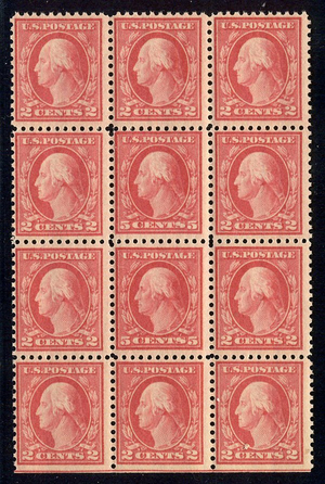 Scott #505: 5c Rose ERROR, P11 Centering & Condition: Mint. Fresh. Fine-Very Fine Double Error Block of 12. Reverse (Gum Side): Original gum. Never Hinged. Faults / Imperfections: None The item pictured is the actual item you are purchasing, unless otherwise noted. I also offer an interest-free layaway plan. Ask me about it!" All items will be mailed a day or two after payment is received. --------------------------------------------------------------------------------
