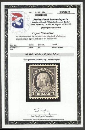 Scott #518: $1.00 Violet Brown, P11 Centering & Condition: Mint. Fresh. XF/SUP and CHOICE! Reverse (Gum Side): Original gum. Never Hinged. Faults / Imperfections: None The item pictured is the actual item you are purchasing, unless otherwise noted. I also offer an interest-free layaway plan. Ask me about it!" All items will be mailed a day or two after payment is received. --------------------------------------------------------------------------------