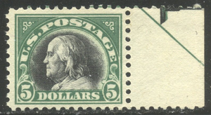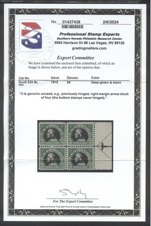 Scott #524: 1918 $5.00 Green & Black Centering & Condition: Mint. Fresh. Rich color. Very Fine. A PSE Certificate for its Reverse (Gum Side): Original gum. Never Hinged. Faults / Imperfections: None The item pictured is the actual item you are purchasing, unless otherwise noted. I also offer an interest-free layaway plan. Ask me about it!" All items will be mailed a day or two after payment is received. --------------------------------------------------------------------------------