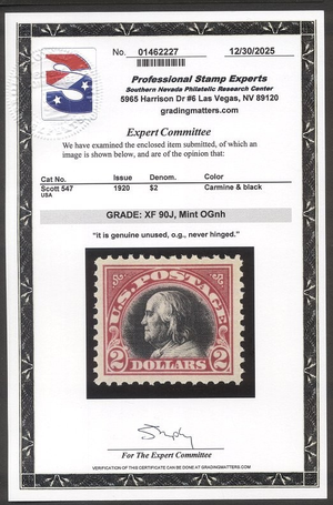Scott #547: 1920 $5 Carmine & Black Centering & Condition: Mint. Fresh. Extremely Fine and CHOICE! A Graded (90) PSE certificate accompanies. Reverse (Gum Side): Original gum. Never Hinged. Faults / Imperfections: None The item pictured is the actual item you are purchasing, unless otherwise noted. I also offer an interest-free layaway plan. Ask me about it!" All items purchased will be mailed a day or two after payment is received. --------------------------------------------------------------------------------