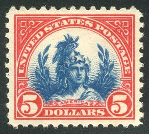 Scott #573: $5 Carmine & Blue Centering & Condition: Mint. Fresh. Rich colors. SUPERB and CHOICE! Reverse (Gum Side): Original gum. Never Hinged. Faults / Imperfections: None The item pictured is the actual item you are purchasing, unless otherwise noted. All items purchased will be mailed a day or two after payment is received. -------------------------------------------------------------------------------- Please click any of the following to read: | |