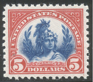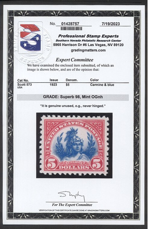 Scott #573: 1922 $5.00 Carmine & Blue Centering & Condition: Mint. Fresh. Rich colors. SUPERB GEM! A Graded (98) PSE Certificate accompanies. Reverse (Gum Side): Original gum. Never Hinged. Faults / Imperfections: None The item pictured is the actual item you are purchasing, unless otherwise noted. I also offer an interest-free layaway plan. Ask me about it!" All items purchased will be mailed a day or two after payment is received. --------------------------------------------------------------------------------
