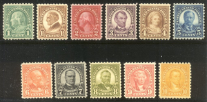 Scott #581-91: 1923 Portraits, P10 Centering & Condition: Mint. Fresh. VF/XF and CHOICE Hand-selected set. Reverse (Gum Side): Original gum. Never Hinged. Faults / Imperfections: None The item pictured is the actual item you are purchasing, unless otherwise noted. I also offer an interest-free layaway plan. Ask me about it!" All items will be mailed a day or two after payment is received. --------------------------------------------------------------------------------