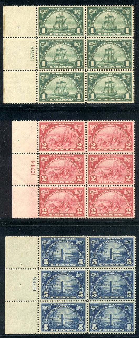 Scott #614-16: 1924 Huguenot-Walloon Set Centering & Condition: Mint. Fresh. Fine-Very Fine and Pretty Matched Left Reverse (Gum Side): Original gum. Never Hinged. Faults / Imperfections: None The item pictured is the actual item you are purchasing, unless otherwise noted. I also offer an interest-free layaway plan. Ask me about it!" All items will be mailed a day or two after payment is received. --------------------------------------------------------------------------------