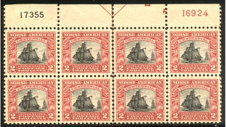 Scott #620: 1925 2c Norse-American Centering & Condition: Mint. Fresh. Extremely Fine and CHOICE Plate Block. Reverse (Gum Side): Original gum. Never Hinged. Faults / Imperfections: None The item pictured is the actual item you are purchasing, unless otherwise noted. I also offer an interest-free layaway plan. Ask me about it!" All items will be mailed a day or two after payment is received. --------------------------------------------------------------------------------