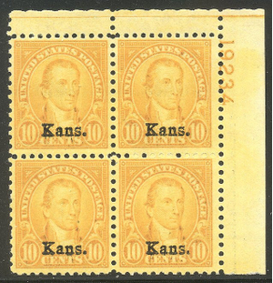Scott #668: 1929 10c Kansas Ovpt Centering & Condition: Mint. Fresh. Very Fine Plate Block. Reverse (Gum Side): Original gum. Never Hinged. Faults / Imperfections: None The item pictured is the actual item you are purchasing, unless otherwise noted. I also offer an interest-free layaway plan. Ask me about it!" All items will be mailed a day or two after payment is received. --------------------------------------------------------------------------------