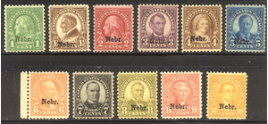 Scott #669-79: 1929 Nebraska Ovpt Issue Centering & Condition: Mint. Fresh. Generally Very Fine and CHOICE set. Reverse (Gum Side): Original gum. Never Hinged. Faults / Imperfections: None The item pictured is the actual item you are purchasing, unless otherwise noted. I also offer an interest-free layaway plan. Ask me about it!" All items will be mailed a day or two after payment is received. --------------------------------------------------------------------------------