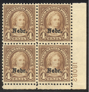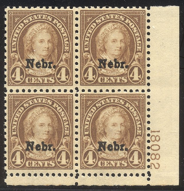Scott #673: 1929 4c Nebraska Ovpt Centering & Condition: Mint. Fresh. Very Fine Plate Block. Reverse (Gum Side): Original gum. Never Hinged. Faults / Imperfections: None The item pictured is the actual item you are purchasing, unless otherwise noted. I also offer an interest-free layaway plan. Ask me about it!" All items will be mailed a day or two after payment is received. --------------------------------------------------------------------------------