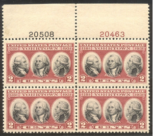 Scott #702b: 1931 2c Yorktown, Dark Lake & Black Centering & Condition: Mint. Fresh. Very Fine and RARE Plate Block of which only a Reverse (Gum Side): Original gum. Never Hinged. Few tiny gum skips. Faults / Imperfections: None The item pictured is the actual item you are purchasing, unless otherwise noted. I also offer an interest-free layaway plan. Ask me about it!" All items will be mailed a day or two after payment is received. --------------------------------------------------------------------------------