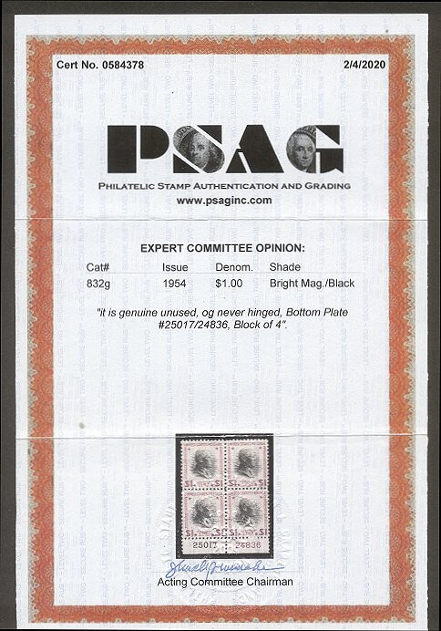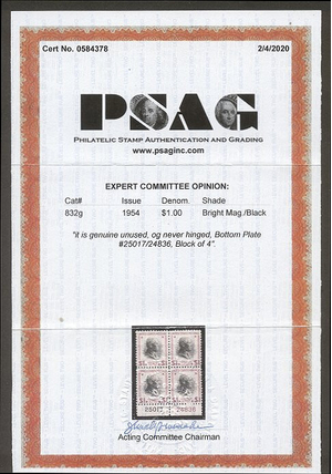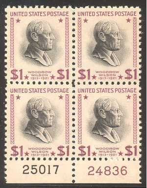 Scott #832g: 1938 $1 Wilson, Bright Magenta Centering & Condition: Mint. Fresh. Very Fine Plate Block in the SCARCER shade. Reverse (Gum Side): Original gum. Never Hinged. Faults / Imperfections: None The item pictured is the actual item you are purchasing, unless otherwise noted. I also offer an interest-free layaway plan. Ask me about it!" All items will be mailed a day or two after payment is received. --------------------------------------------------------------------------------