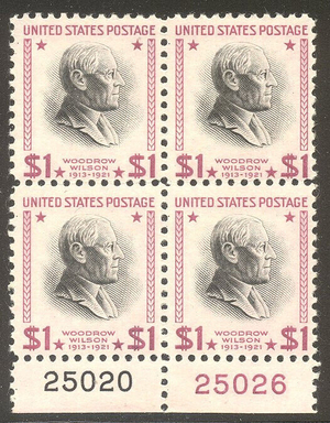 Scott #832g: 1938 $1 Wilson, Magenta Shade Centering & Condition: Mint. Fresh. Fine- Very Fine and SCARCE Plate Block. A Foundation certificate accompanies.. Reverse (Gum Side): Original gum. Never Hinged. Faults / Imperfections: None The item pictured is the actual item you are purchasing, unless otherwise noted. I also offer an interest-free layaway plan. Ask me about it!" All items will be mailed a day or two after payment is received. --------------------------------------------------------------------------------