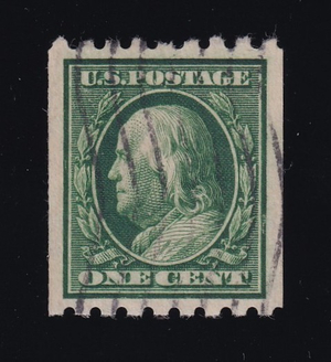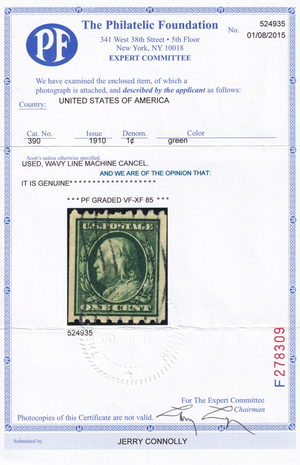 US Scott #390 1 Cent Franklin - used - w/cert SMQ $30
