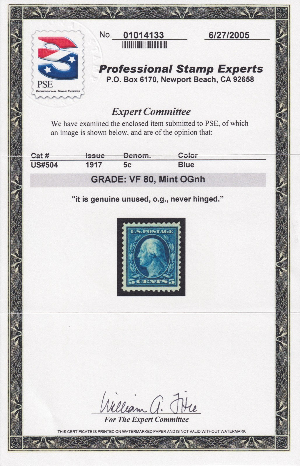 US Scott #504 5 Cent Washington MNH OG w/cert
