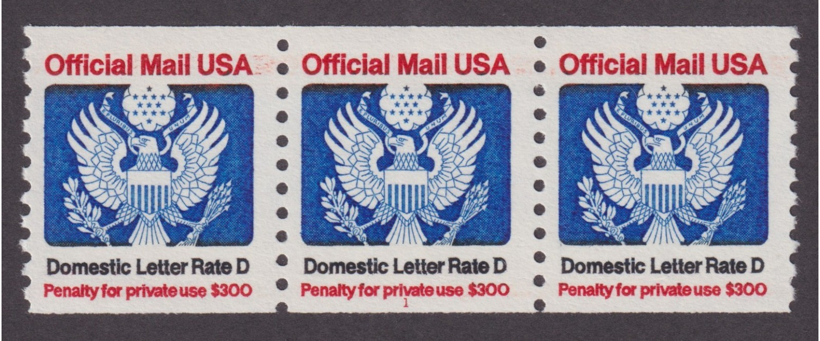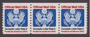 US Scott #O139 22 Cent "Official Mail Letter Rate D" Plate# strip of 3 Plate# 1 MNH OG CV $15