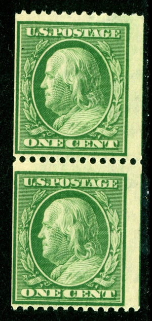 USA 1908 Franklin 1¢ Green Sc 348 Horz Coil Pair Perf 12 DL Wmk MNH J142