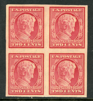 USA 1909 Lincoln 2¢ Carmine Imperf Block Sc #368 MNH V633