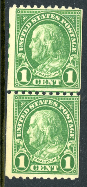 USA 1924 Franklin 1¢ Green Perf 10 Rotary Coil Line Pair Scott 604 MNH Q866